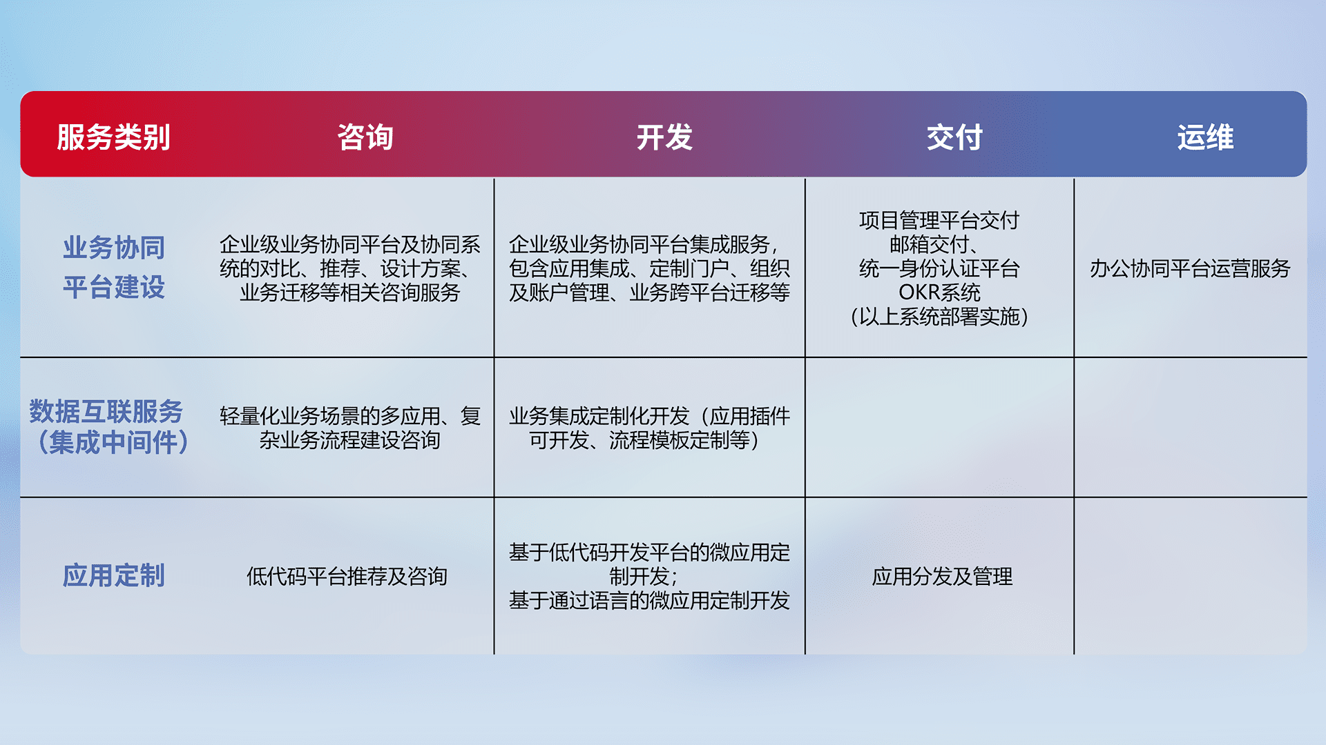 针对钉钉、、、企微、、、、IDaas等平台级产品提供产品的规划、、、、方案、、、交付、、、定制化开发等服务,,实现如统一协同办公、、智能客户服务、、、、混合会议管理、、智能数据查询、、等业务场景,,,,实现数字化转型。。