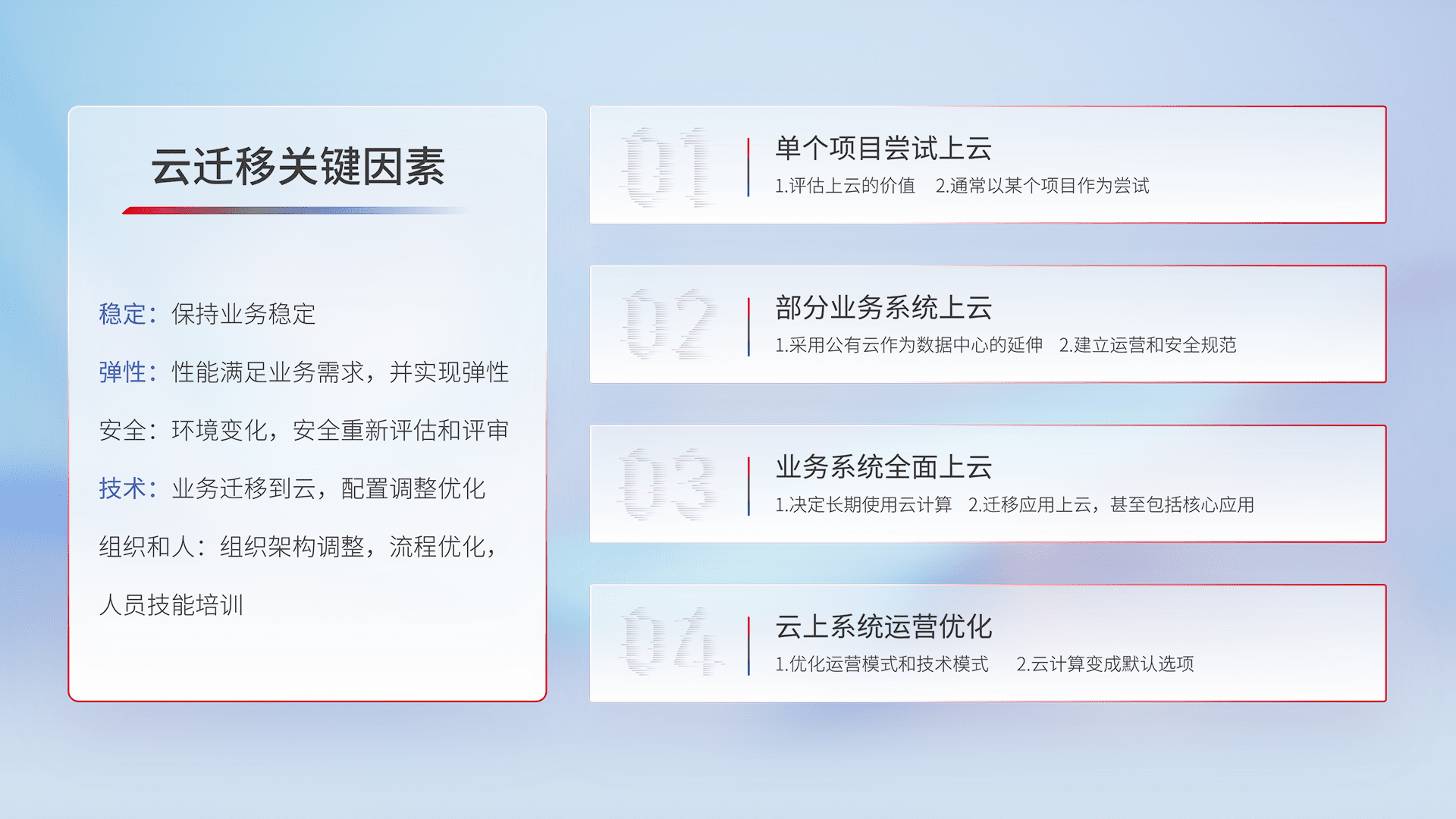 结合实际业务,,从规划设计、、、云平台选型、、、、云原生改造、、、数据迁移、、集成交付,,,迁移全过程为客户识别最佳上云路径,,,,做好风险识别管理,,,,设计网络架构、、身份权限、、安全审计合规、、、、操作审计、、日志审计、、、监控告警策略、、、、多站点容灾设计等,,对云上基础设施进行整体规划,,提升IT治理水平,,,以满足弹性、、高可用、、、高性能的需求。。。。